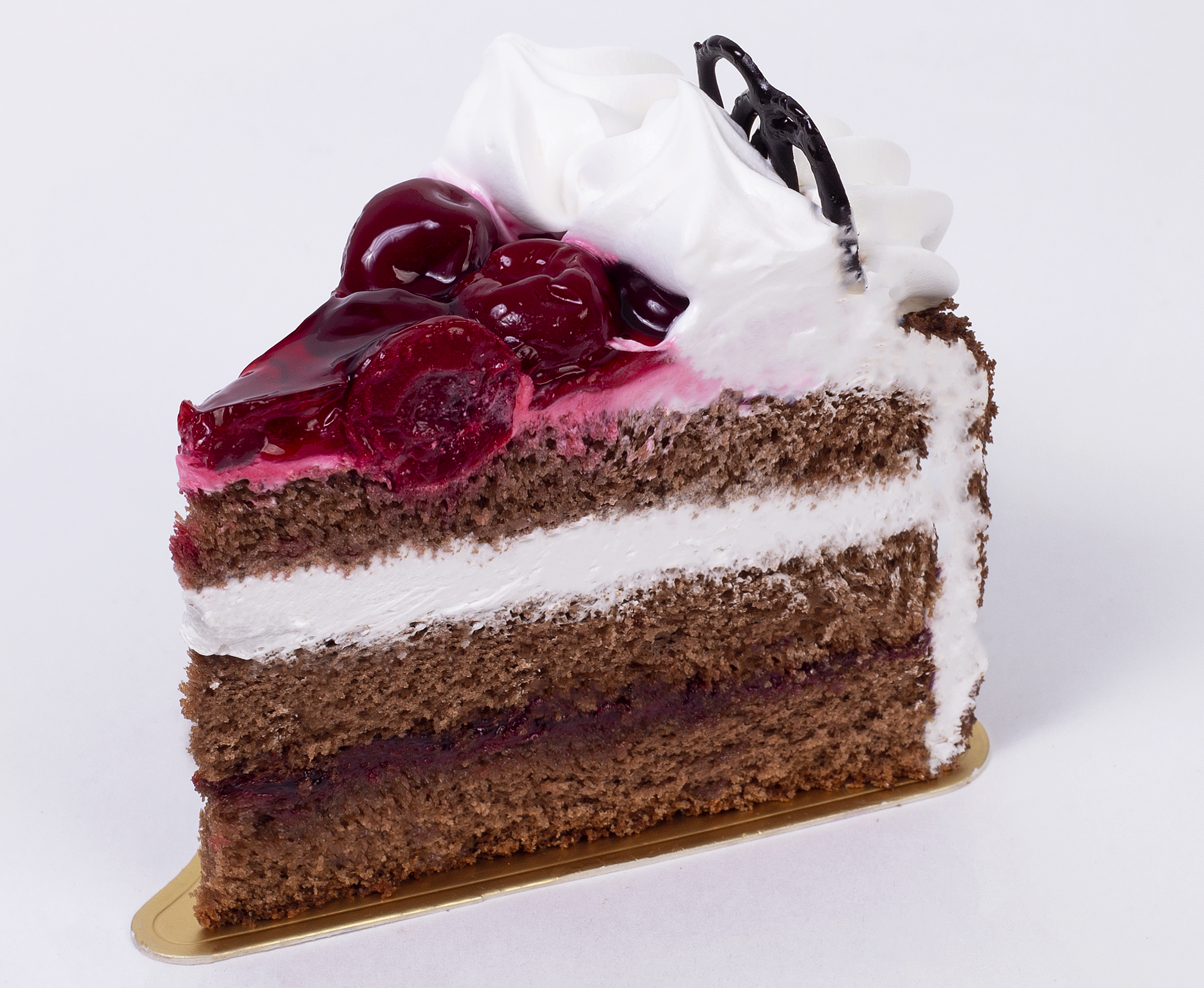 Шоколадный бисквит пропитан сахарным сиропом, прослоен вишней в желе и кремом на основе сгущенного молока. На боковой поверхности бисквитная крошка «Захер». Верх торта украшен цветами из крема на основе вареной сгущенки, вишни залитой желе и рисовкой из какаосодержащей глазури.
