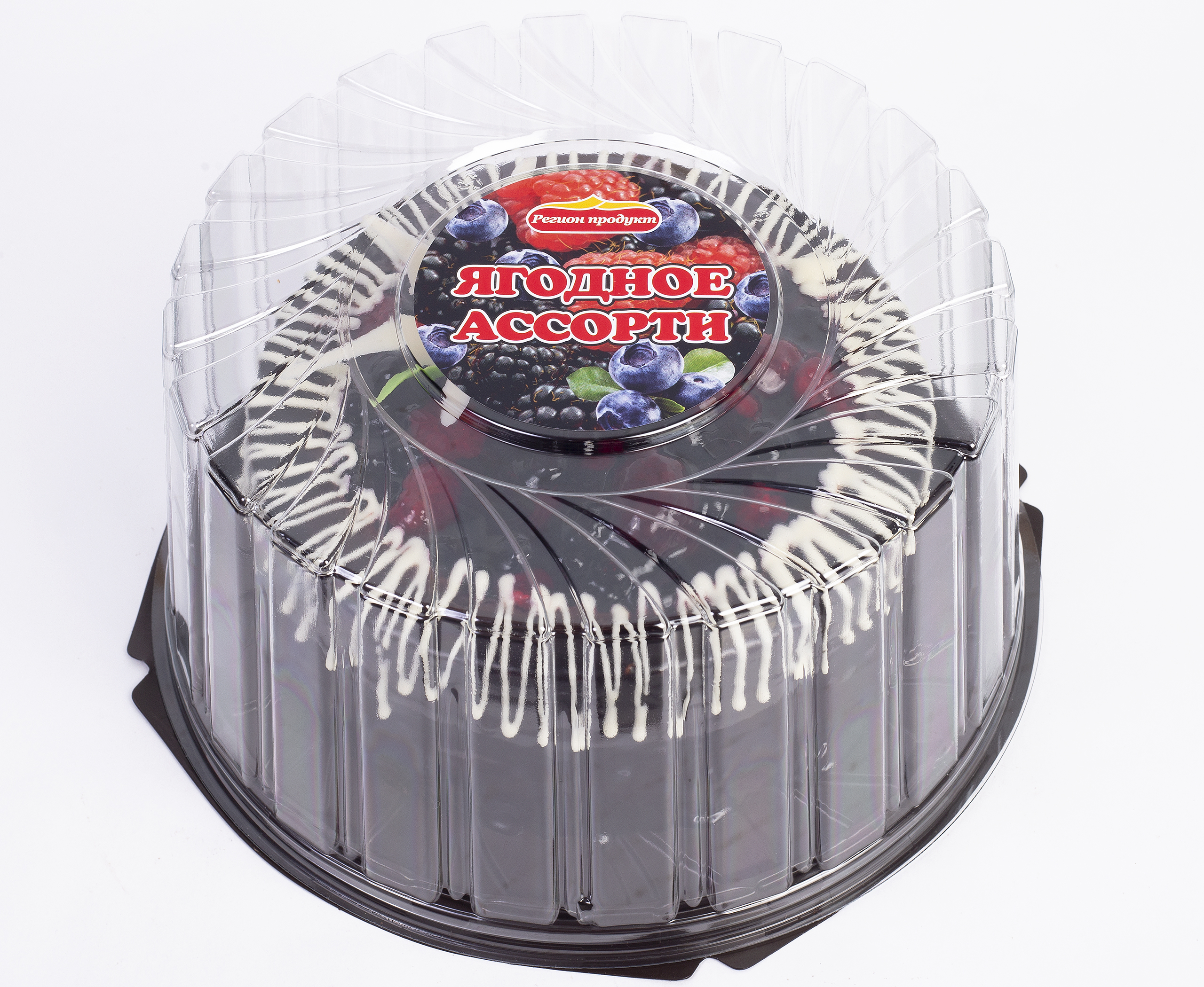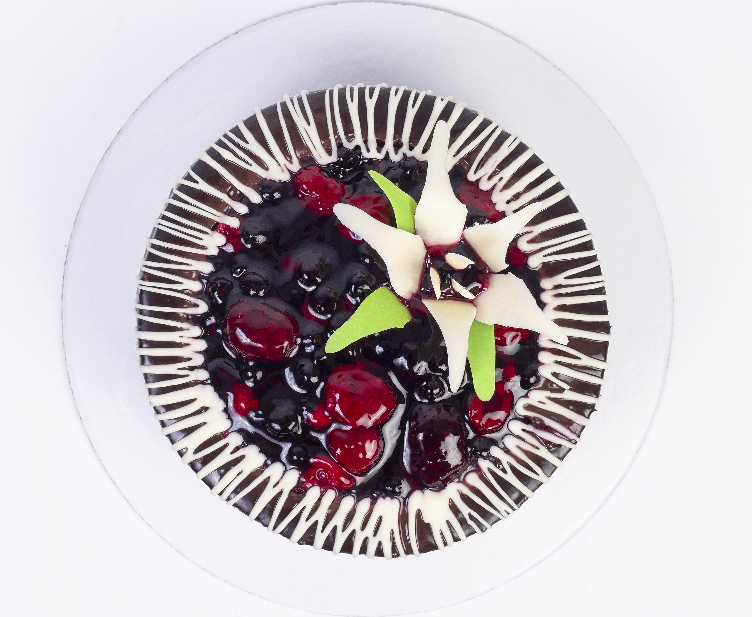 Светлый, легкий бисквит пропитан сиропом, прослоен кремом с ванилью и сочными ягодами. Боковая поверхность залита кремом ганаш. Сверху уложены ягоды, залитые желе. Декор из молочной глазури в виде подтеков и цветка.