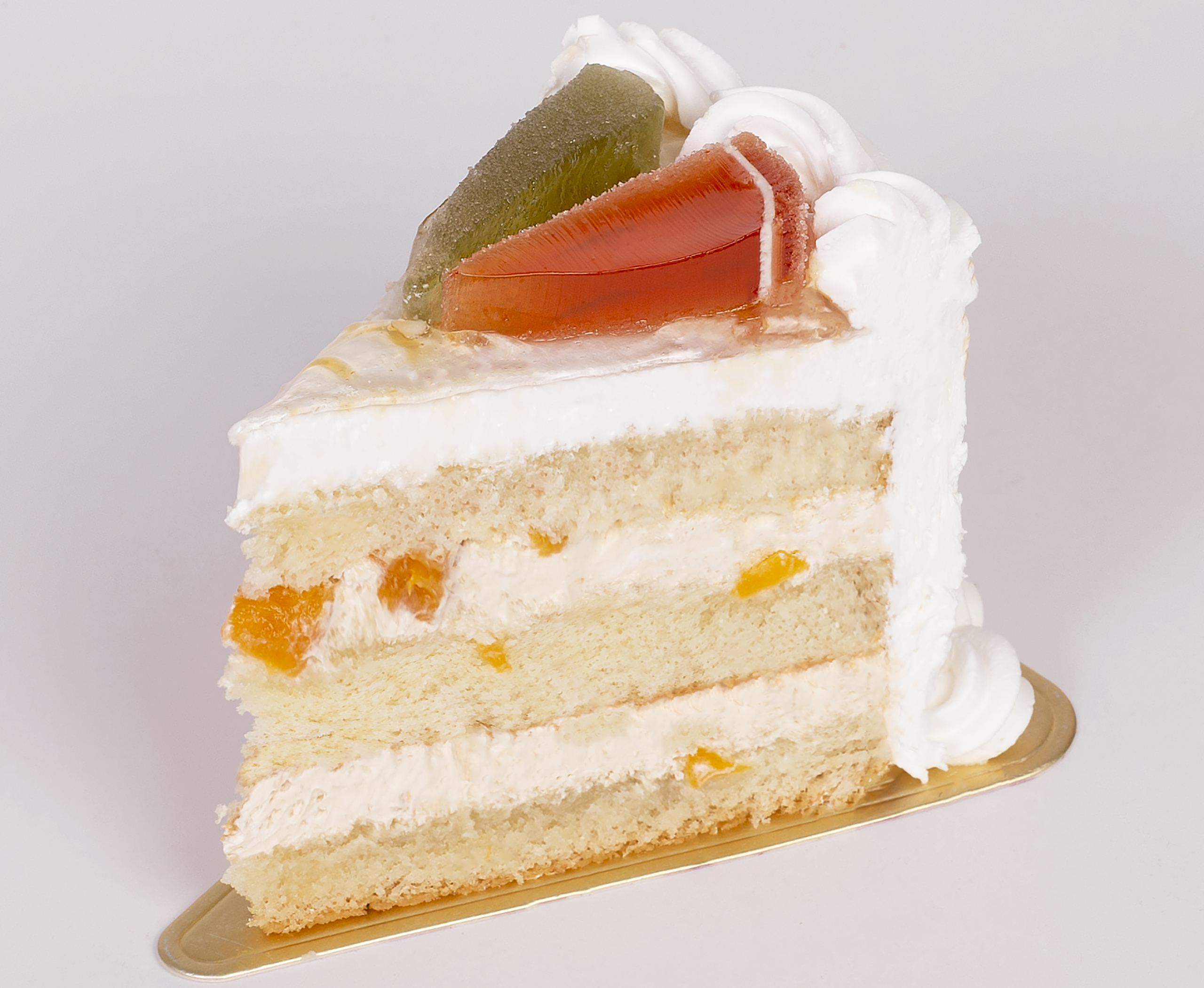 Светлый бисквит пропитан сахарным сиропом, прослоен кремом на основе вареной сгущенки и кусочками персика. Поверхности отделаны кремом на йогуртной основе. Верх торта украшен гелями, декором из белой и какаосодержащей глазури, а также, кусочками мармелада.